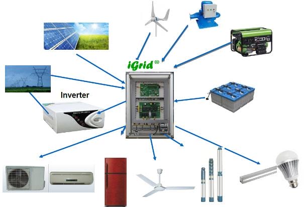 In the above schematic different forms of renewable energy sources are coupled together in a smart micro grid. iGrid takes inputs from several of them like Solar Panels, Rooftop Micro Wind, PICO Hydel, Biogas generation system and the electricity grid.