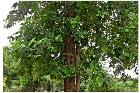 A small to medium-sized, deciduous tree up to 11-meter tall with a dense, rounded crown; bark blackish-brown, deeply cut into rectangular plates, yielding a deep red latex when cut; heartwood extremely hard, dark purple. Leaves usually imparipinnate, 10-18 cm long; leaflets 3, rarely 4-5, 3.8-7.6 cm long, broadly ovate or orbicular, coriaceous, apex obtuse, slightly emarginate, undersurface pale and clothed with fine grey hairs. Flowers yellow, borne a few together in simple or sparingly branched racemes; pedicels c. 5 mm long; calyx 5-6 mm long, teeth minute, deltoid. Fruits (pods) obliquely orbicular, 3.8-5 cm in dia including the wing, base narrowed into a short, concavely curved stipe 8 mm long, woolly. Seeds 1-2, reddish-brown, smooth, leathery, 1-1.5 cm long (India Biodiversity Portal.com).