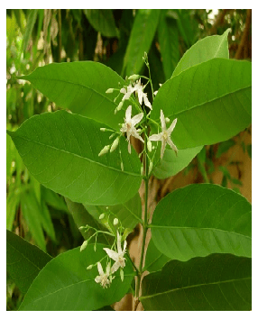 Deciduous trees; up to 15 m; bark 8-10 mm thick, grey, smooth; outer layer thin, inner layer thick, brittle, creamy; blaze greenish-yellow; latex milky white. Leaves simple, opposite, distichous, estipulate; petiole 2-5 mm long, stout, glabrous; lamina 3.5-11 x 2-4 cm, oblong-lanceolate or elliptic-ovate; base acute; apex acuminate or caudate acuminate; margin entire, glabrous, glaucous beneath, chartaceous; lateral nerves 5-10 pairs, slender, arched, pinnate, prominent, inter-costae reticulate. Flower bisexual, white, scented, in terminal cymes appearing along with new leaves; pedicel 1.5 mm long, bracts 2, minute; calyx lobes 5, with membranous margin, 2 mm, ovate, obtuse, ciliate, glandular inside; corolla salver shaped, lobes 5, broad lobes 12 x 5 mm, oblong, obtuse, throat with 1-2 series of erect, fimbriate corona scales, tube 1.5-2mm; stamens 5, inserted on the mouth of the tube, anthers sagitate, spurred at base, conniving and adhering to the stigma; disc absent; carpels 2, free, many ovuled, style filiform, stigma ovoid, usually with a toothed basal ring. Fruit of 2 follicular mericarps, 15-45 cm long, slender, smooth, green, cylindric, cohering at the tip; seed 16 mm long, black, commate at one end. (India Biodiversity Portal.com).