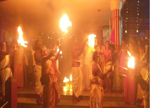 On 20th March 2019, on the full moon day occasion local stakeholders conducted Teertha Pooja at Kapi Teertham and Agni Teertham. Volunteers cleaned the Teerthams, drawn the Rangoli and lighted beautiful lamps for Pooja. Then Teertha Namavali was chanted by all the participants. The programme ended by offering flowers and Turmeric to the Teertham. Around 30 Ladies and children’s participated in the programme.