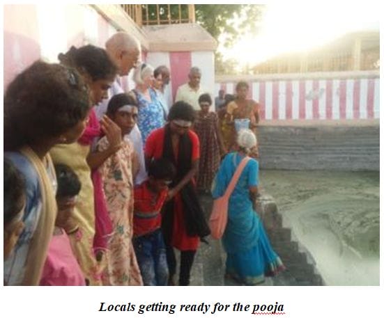 Teertha Pooja was organized by the local community at Jata Teertham. Ms.Sarah from England and Smt.Jayshree Balachander participated in the Pooja. Around 25 villagers including kids gathered at the Teertham and were singing devotional songs about lord Shiva in the temple. Simultaneously women were also cooking Sweet Pongal (Rice) to be offered to the God. Then everybody gathered around the Teertham for prayers. Shri.Pakshi Sivarajan, Priest from Rameswaram guided the gathering on Teertha Pooja. He was chanting mantras and the gathering were repeating the same. After the completion of the Teertha Pooja, people offered flowers to the Teertham and sprinkled the Holy water on their heads.