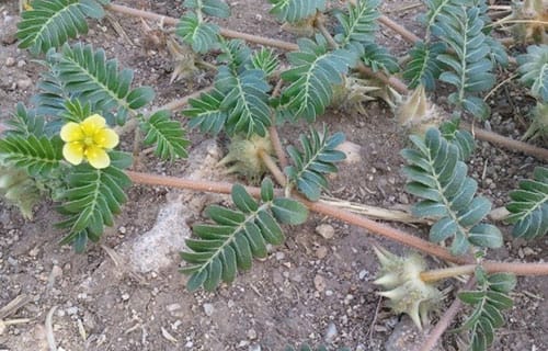 Tribulus terrestris L. is a dicotyledonous herbal plant of the Zygophyllaceae family. It is found all over India up to 11,000 ft in Kashmir, Ceylon, and all warm regions of both hemispheres. T. terrestris is a common weed plant with divaricate spines found in sandy soil and waste lands. It is a trailing perennial, hairy, and branched herb. Leaves are stipulate, opposite usually unequal and abruptly pinnate. Leaflets are 5-8 in pairs with length 0.5 – 1.3 cm. Flowers are yellow, solitary, axillary, 8-12 mm in diameter and appear during July-August. Fruits are globose and spinosus produced during autumn. It consists of 5-12 woody cocci, each with two pairs of hard sharp spines, one pair longer than the other. Each coccus contains several seeds with transverse partition between them.
