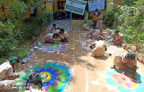 Four awareness programmes were conducted in educational institutions in the Municipality viz. (i) SPA Girls Higher Secondary School (03rd February), (ii) MPU Primary School No: 1 (03rd February), (iii) MPU Primary School – Ramanathasamy Nagar (13th February) and (iv) MPU Primary School – Erakadu (17th February). A total of 285 students were senstized on the importance of MSWM, segregation of waste at source and environmental conservation through Power Point presentations and Rangoli competitions.