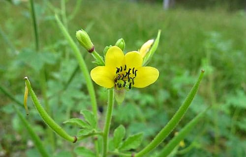 Cleome viscosa belongs to the family Cleomaceae and is a weed widespread in various warmer parts of the world like India, Pakistan, Africa, Ethiopia, peninsular Arabia, Australia, Cambodia, Indonesia and Japan. The plant is an annual, sticky herb with a strong odour with glandular and simple hairs. It grows about 90-120 cm high and is branched. The leaves are 3-5 foliate, obovate and obtuse. The flowers are yellow, axillary, growing out into a lax raceme. The fruits are capsules, dark brown 30-75 mm long, compressed and hairy throughout, while the seeds are finely transversely striate, sub globose and become brownish-black when ripe.