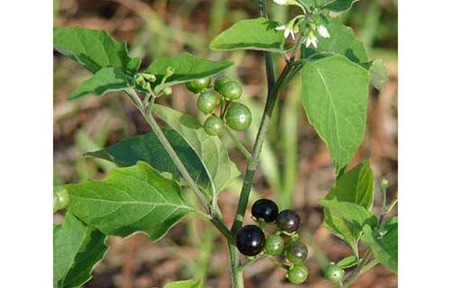 Solanum nigrum L commonly known as Black Nightshade is a dicot weed in the Solanaceae family. The black nightshade is widely distributed in various habitats throughout the world, from tropical to temperate regions and from sea level to altitudes exceeding 3500 m. It is a common species in wet woods, near river, wasteland, old field, ditches, roadside and cultivated land. It is an annual herbaceous plant of 30-100 cm height, pubescent with simple hairs. Leaves are alternate, ovate, deep green with an indented margin, acuminate. Flowers are white with yellow colored centre. The berry is mostly 6 to 8 mm in diameter, green at early stage and turn to black when ripe.